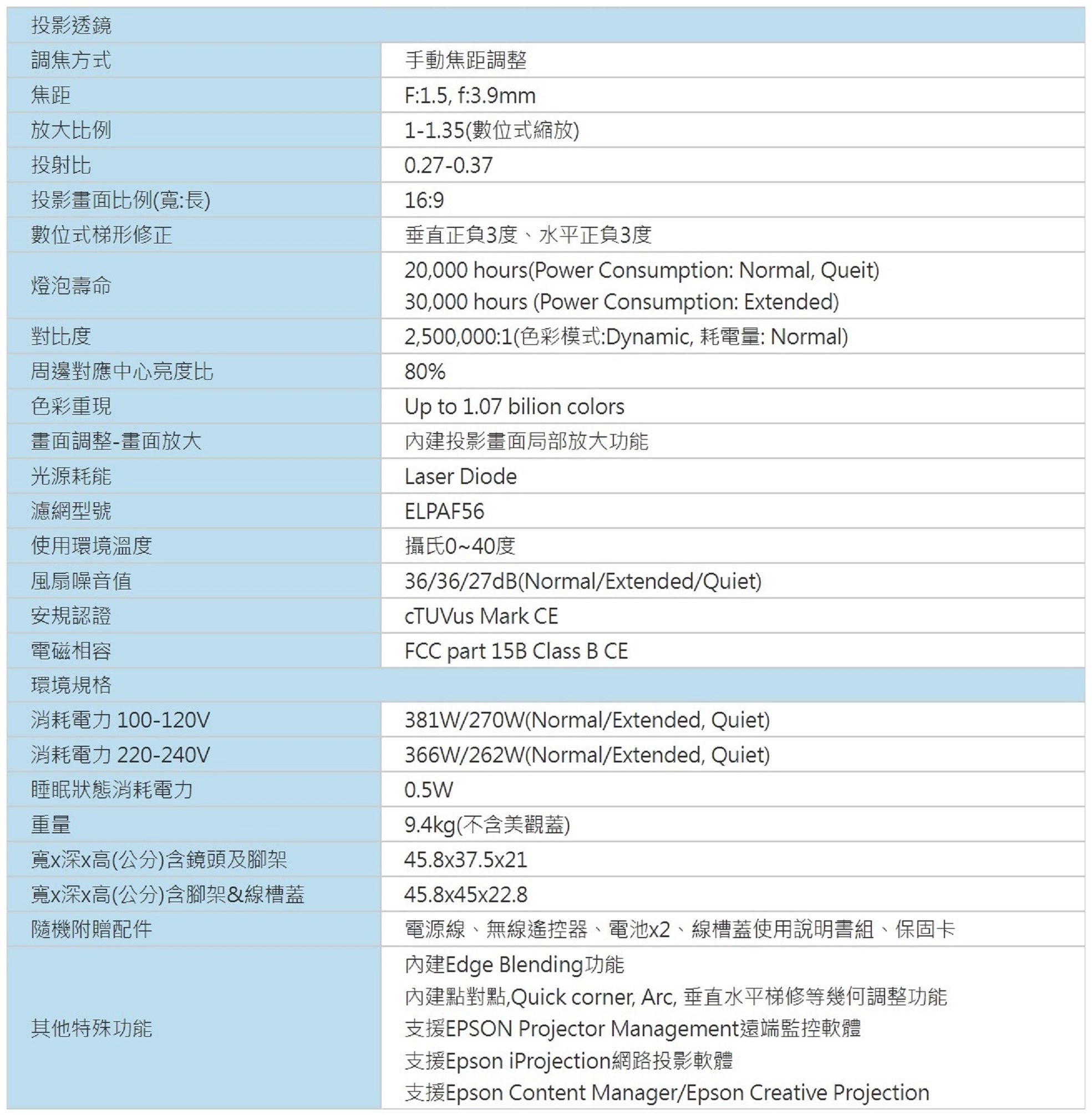 | 品名 | 5000流明 Epson EB-805F 雷射超短焦投影機 |